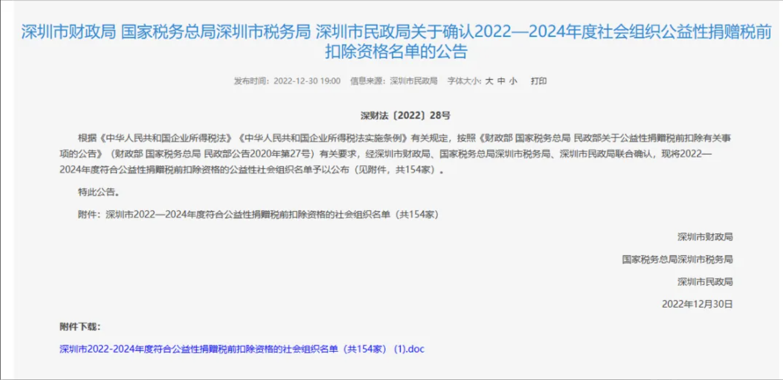 2022年12月30日,深圳市财政局 国家税务总局深圳市税务局 深圳市民政局发布了《2022—2024年度社会组织公益性捐赠税前扣除资格名单的公告》,深圳市猛犸公益基金会获得(2022-2024年度)公益性捐赠税前扣除资格。