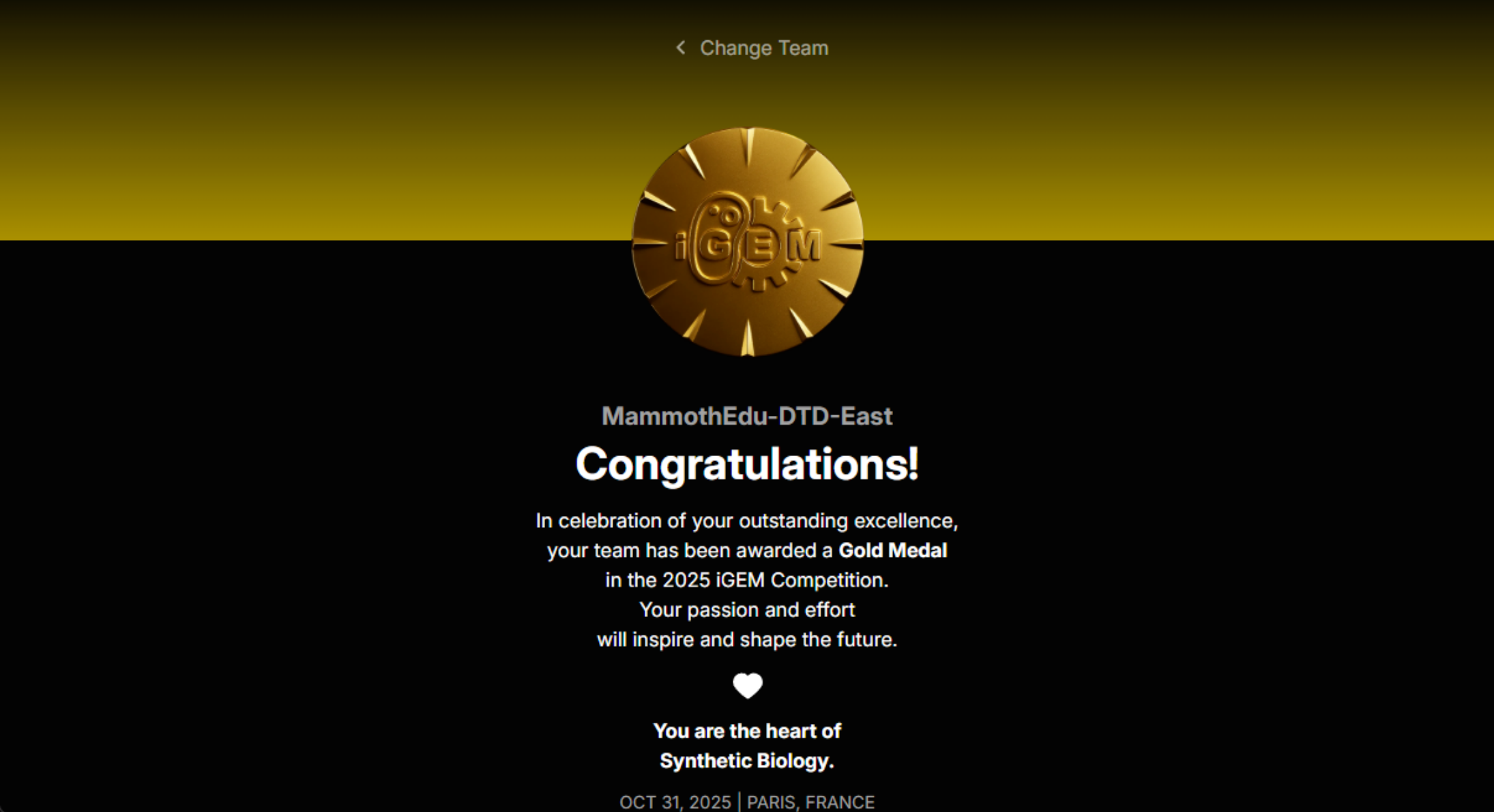 2025年10月31日,国际基因工程机器大赛(iGEM)在法国巴黎落下帷幕。猛犸教育带领的两支高中生战队——MammothEdu-DTD-East与MammothEdu-South分别斩获金牌和银牌。